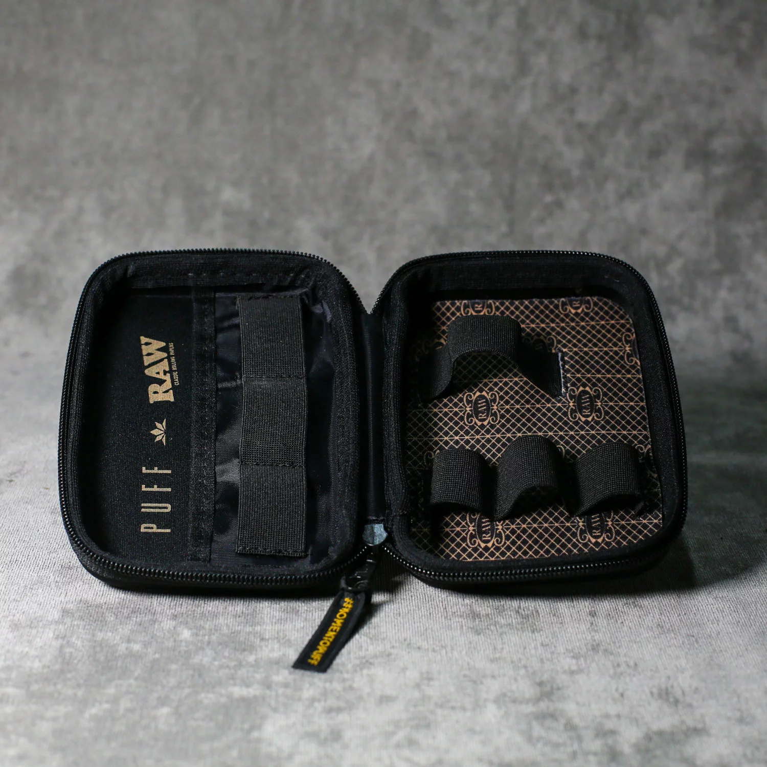 A arte do Case Pufflife Clássico Raw Black exibe um acabamento elegante em preto sóbrio, complementado por um forro interno estampado que agrega uma estética única e moderna ao seu interior. Seu zíper reforçado proporciona segurança adicional, enquanto detalhes sutis da marca em alto-relevo dão um toque de exclusividade. É uma peça que exala sofisticação e contemporaneidade.